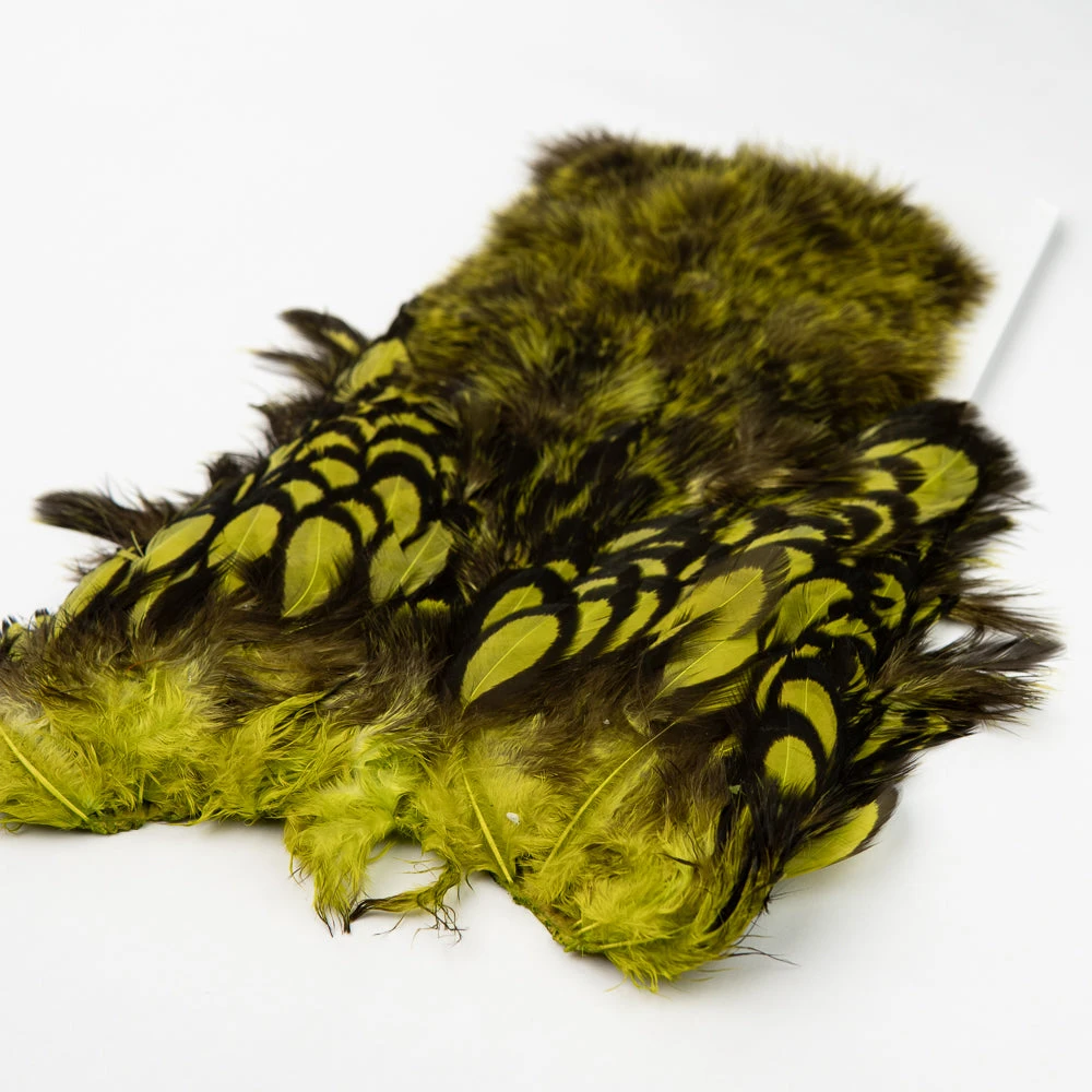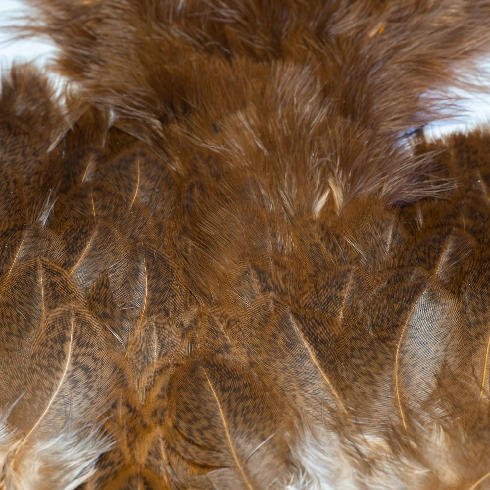 Two very unique feathers in 1 pelt. The first feather, the soft hackle, is a wide, webby, soft feather great for large collars on salmon, steelhead, bass, and saltwater flies. The second feather, the chickabou is a smaller marabou. Much finer than turkey marabou, the chickabou is excellent for small streamers, leech patterns, dragonfly, and damselfly nymphs.